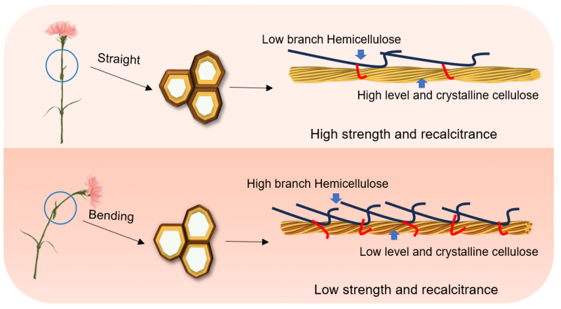云南是全球第二大鲜切花交易中心,昆明斗南花市是亚洲最大的鲜切花交易市场,鲜切花在国内市场占有率在70% 左右,形成了以玫瑰、康乃馨、百合、洋桔梗、非洲菊等为优势品类,以荷花、睡莲、绣球、向日葵、郁金香等为新兴品类的鲜切花种类及品种结构。荷花在鲜切花瓶插过程中存在严重的弯茎、花茎折断、萎蔫及切茎腐烂等影响花茎品质问题,相比于玫瑰、康乃馨、百合、洋桔梗和非洲菊等鲜切花品类,荷花采后这些问题尤为严重。为了系统探索荷花等鲜切花花茎杆弯曲的普遍规律,本研究全面解析了云南斗南花市代表性的六对鲜切花品类(荷花、睡莲、玫瑰、非洲菊、洋桔梗和康乃馨)直立茎与弯曲茎的细胞壁组成结构差异。最终揭示了细胞壁重塑因子——即被局限在纤维素微纤丝中的半纤维素或果胶侧链会影响纤维素的结晶度、纤维素纯度和纤维素长度,从而减少了机械力和细胞壁的难降解性,最终导致植物的茎杆弯曲(图1)。