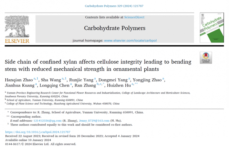 西南林业大学园林园艺学院胡慧贞副研究员和云南大学农学院张冉副研究员为Carbohydrate Polymers论文通讯作者。西南林业大学园林园艺学院硕士研究生赵晗茜和王莎为该论文第一作者,陈龙清教授参与了论文指导,硕士研究生杨冬梅、赵永晶、匡健华和本科生杨润杰参与了该项研究。