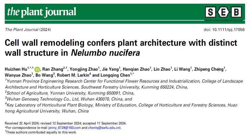 2024年1月10日和10月20日,Carbohydrate Polymers(中科院一区Top期刊,IF=10.7)和Plant Journal(中科院一区Top期刊,IF=6.2)分别在线发表了西南林业大学园林园艺学院特色园林花卉观赏性状形成与种质创新团队题为“Side chain of confined xylan affects cellulose integrity leading to bending stem with reduced mechanical strength in ornamental plants”和“Cell wall remodeling confers plant architecture with distinct wall structure inNelumbo nucifera”的研究成果。该研究全面解析了荷花等鲜切花品类花茎产生相对“直与弯”表型及荷花大小株型的细胞壁精细结构性机理,多层次解析出了介导荷花等地上茎发育(花茎品质形成和株型建成)的关键因子为细胞壁重塑类,为今后荷花等花卉种质分子遗传改良及新品种选育提供了新的思路和优异基因资源。