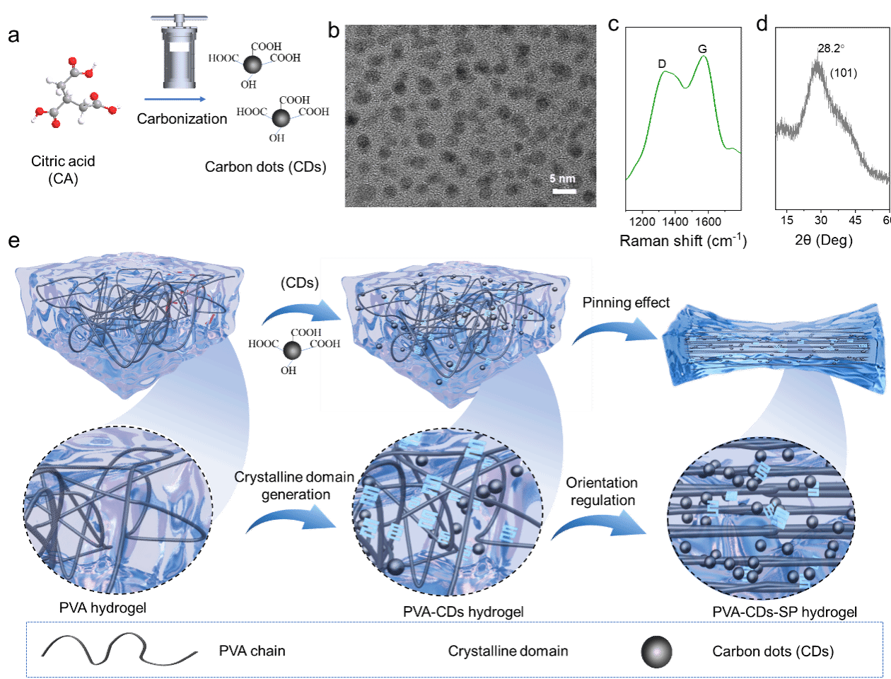 图1碳点诱导结晶域和超强超韧水凝胶制备策略