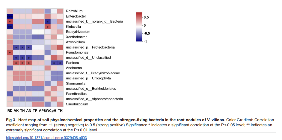 近日,我校生物与食品工程学院硕士研究生在中国西南石漠化地区光叶紫花苕根瘤内生细菌及固氮菌多样性与土壤理化性质相关性研究方面取得新进展。以生物与食品工程学院硕士生齐圆圆等为第一作者、团队指导教师王金华副教授为通讯作者的2项研究成果同期分别发表于SCI期刊《Current Microbiology》和《PLOS One》,文章题为“Community Distribution of Endophytic Bacteria in Nodules of Vicia villosa in Rocky Desertification Area of Southwest China”(文章链接:https://doi.org/10.1007/s00284-025-04436-2)、“Relationships between nitrogen-fixing bacteria community structure in Vicia villosa nodules, soil properties and rocky desertification degree in karst area southwest China”(文章链接:https://doi.org/10.1371/journal.pone.0329408),影响因子达到5.8。