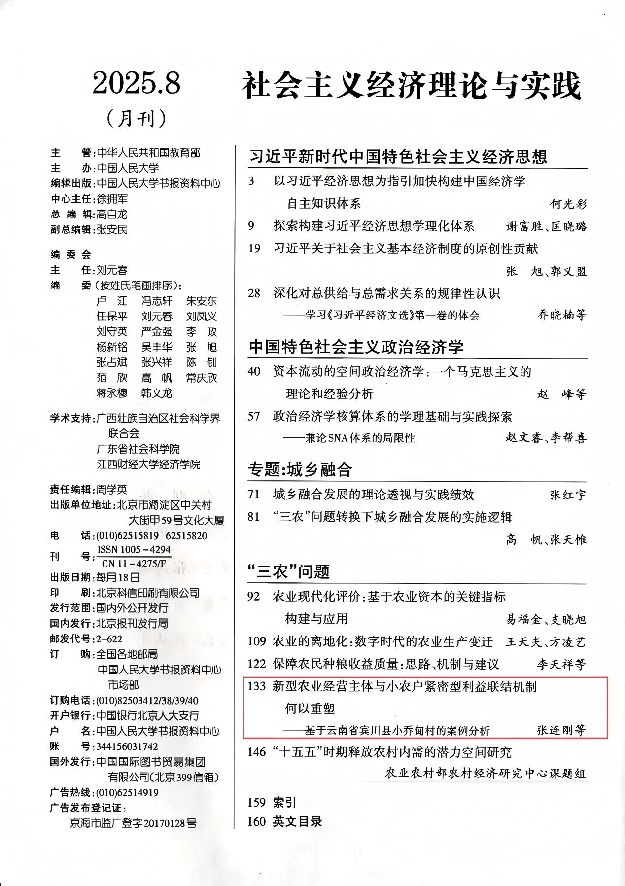 近日,西南林业大学经济管理学院张连刚教授与农林经济管理专业硕士研究生袁伟、博士研究生陈天庆共同撰写的文章《新型农业经营主体与小农户紧密型利益联结机制何以重塑——基于云南省宾川县小乔甸村的案例分析》被中国人民大学复印报刊资料《社会主义经济理论与实践》2025年第8期全文转载。