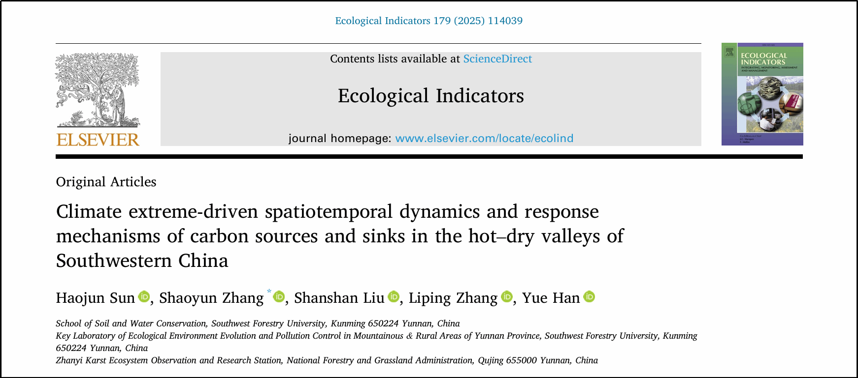 近日,以西南林业大学水土保持学院为第一单位,张绍云老师作为通讯作者,指导本科生在国际生态环境领域一流期刊《Ecological Indicators》(中国科学院一区TOP,IF 7.4)上发表题为《Climate extreme-driven spatiotemporal dynamics and response mechanisms of carbon sources and sinks in the hot-dry valleys of Southwestern China》的研究论文。该研究立足极端气候频发的背景,探讨我国西南干热河谷这一典型生态脆弱区碳通量时空演变规律、非线性驱动机制及滞后响应特征,为该区域的碳中和规划与生态安全预警提供了新视角新思路。