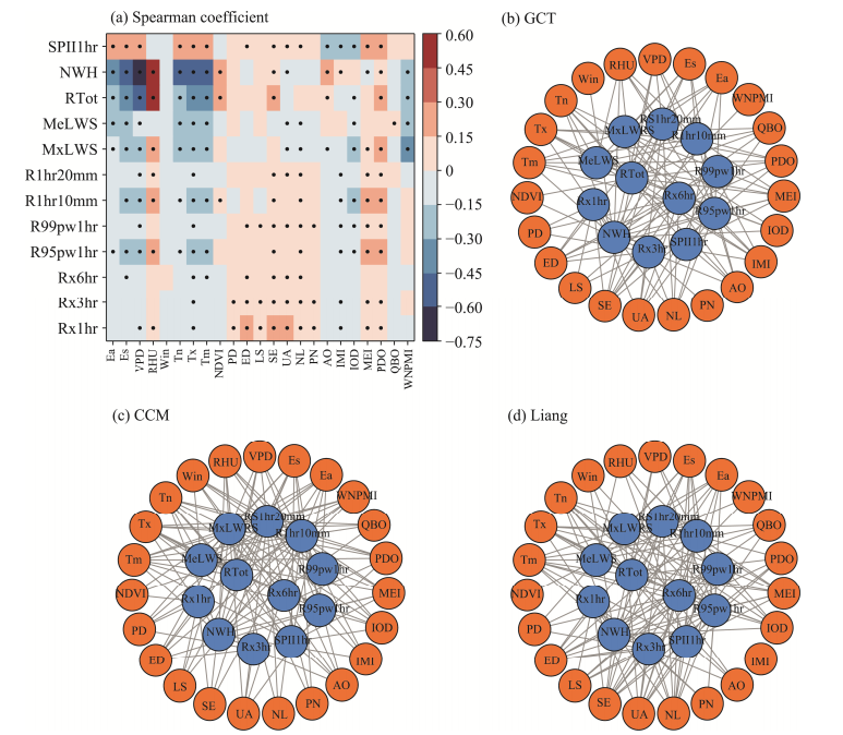研究利用2004 - 2020年滇中城市群31个观测站的逐时降水资料,基于动态城乡划分和三种因果关系检验方法(格兰杰因果检验、梁-克里曼信息流、收敛交叉映射),系统揭示了滇中城市群极端小时降水的时空变化特征及其驱动因素。研究结果表明,2004 - 2020年滇中城市群逐时降水以短周期为主,极端小时降水主要发生在午后和夜间;城区极端小时降水发生频率和强度均呈显著上升趋势,且变化率高于农村;另外,大尺度环流、城市化以及自然环境因素以不同方式增强极端小时降水,并且这些因子的相互作用将进一步影响滇中城市群的极端小时降水。