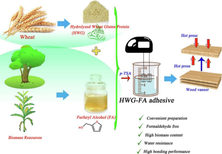 近日,材料与化学工程学院国家生物质材料国际联合研究中心陈新义博士、周晓剑研究员和杜官本教授等合作再次在化工领域国际权威期刊《Chemical Engineering Journal》(一区TOP,IF=16.7)上发表题为《Development of easy-handled, formaldehyde-free, high-bonding performance bio-sourced wood adhesives by co-reaction of furfuryl alcohol and wheat gluten protein》的研究论文(https://doi.org/10.1016/j.cej.2023.142161),报道了一种以小麦水解蛋白和糠醇为原材料的无甲醛高性能生物质环保胶黏剂。陈新义博士和2021级硕士研究生杨正勇为论文并列第一作者。